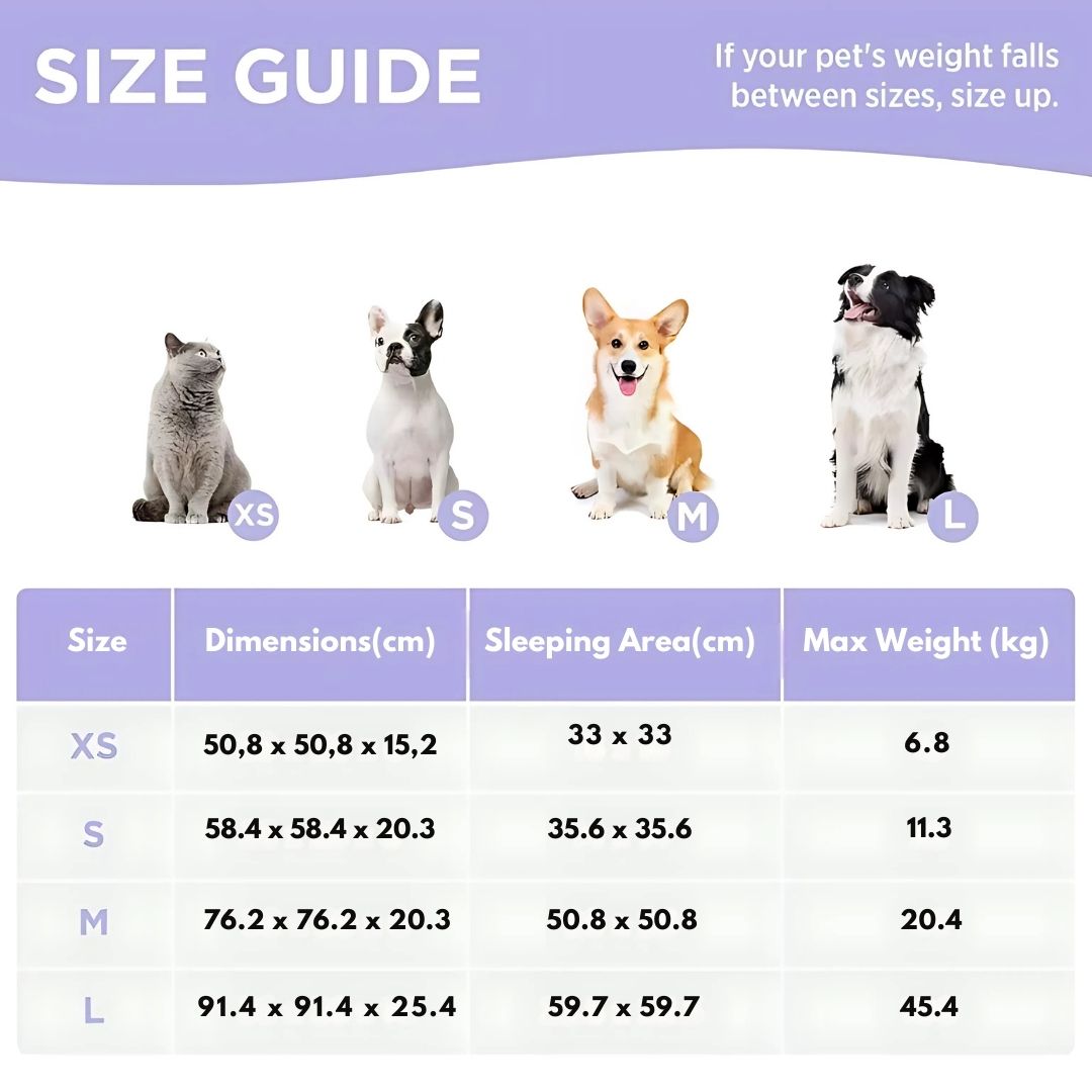 No worries! To help you find the perfect fit for your pet, we’ve provided a convenient size chart. Simply measure your pet and refer to the table below to select the ideal size for maximum comfort. Your pet’s new cozy retreat is just a few steps away!